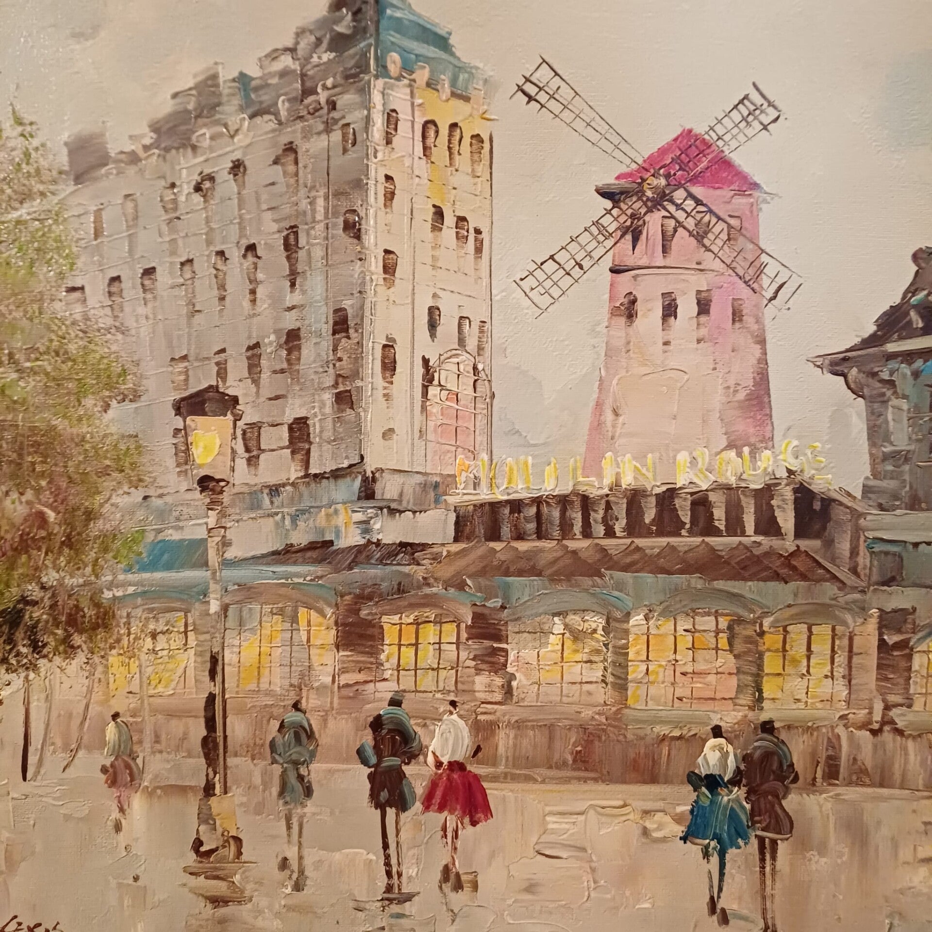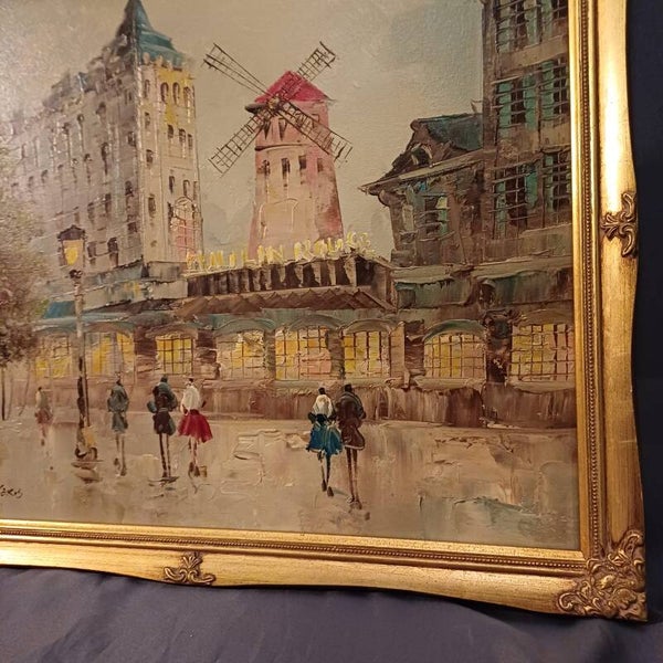 Lovely warm twilight Parisian street scene featuring the Moulin Rouge by L.Alexis. Original mid-century oil painting in its original vintage gilt frame.Height is 47cm and width is 57cm.