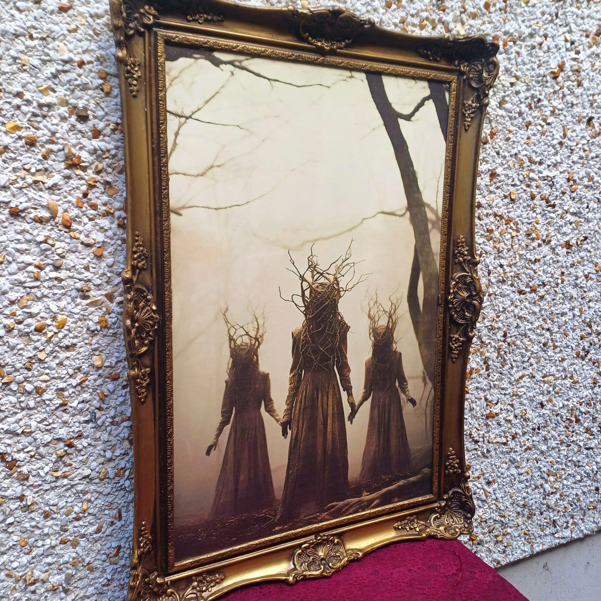 Canvas on board in lovely ornate gothic dark gold frame. Frame measures 80cm x 57cm.