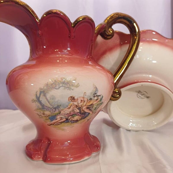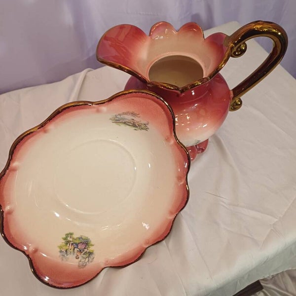 Beautiful vintage glazed ceramic Staffordshire potteries wash jug and bowl by KLM. Dark dusky pink and cream with 2 different lovely pastoral scene depicted on each side. Lovely condition with no cracks or chips.