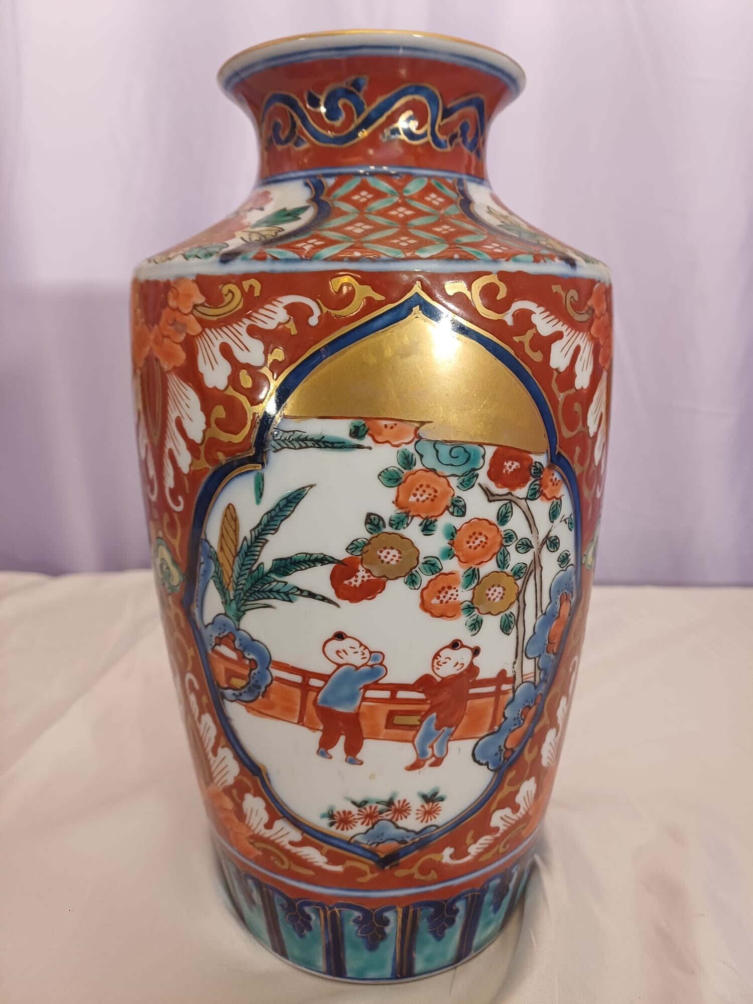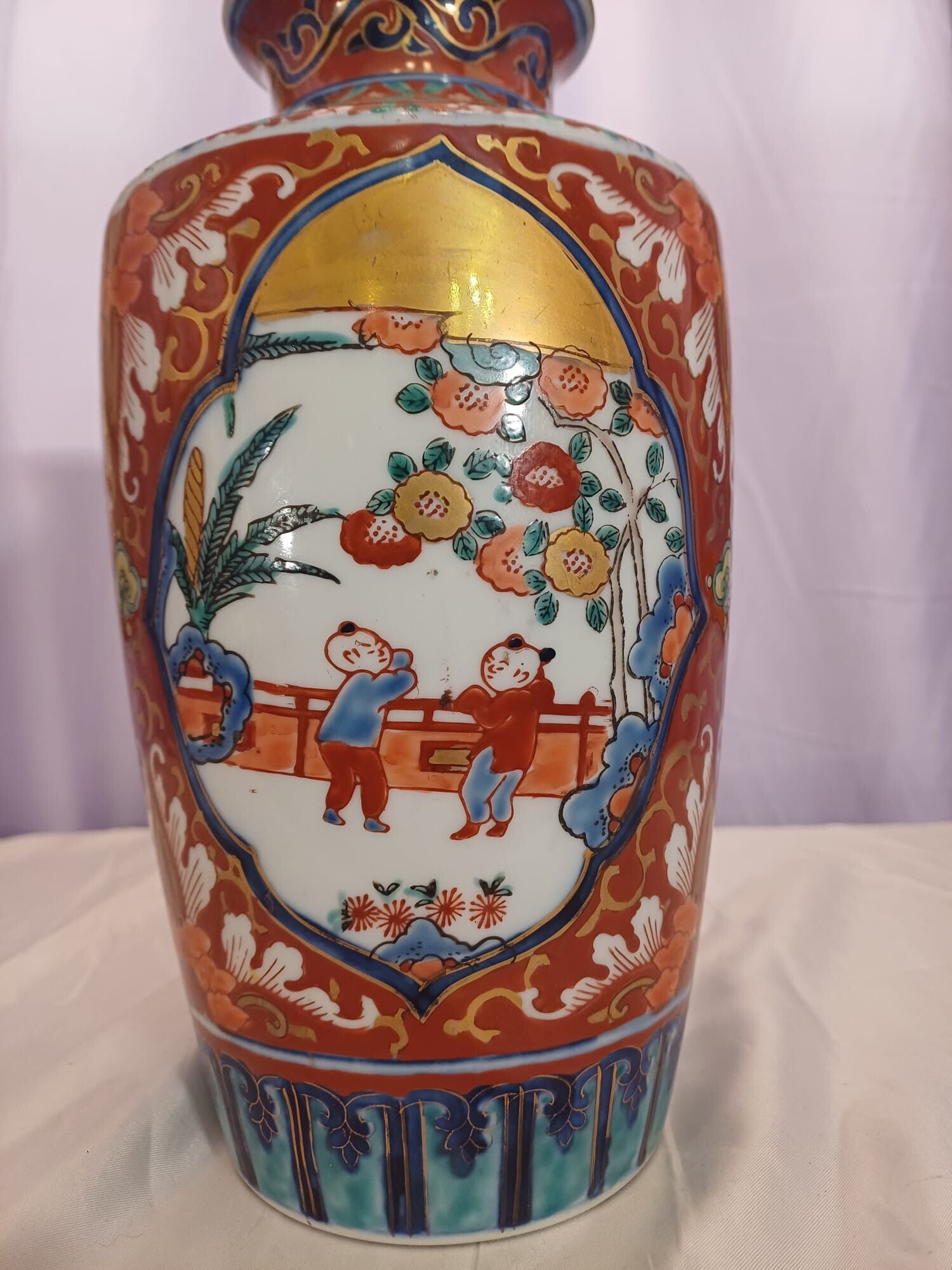 This is a lovely vintage Satsuma vase with hand painted decorative motif of Chinese children playing. Beautiful condition. No chips or cracks.