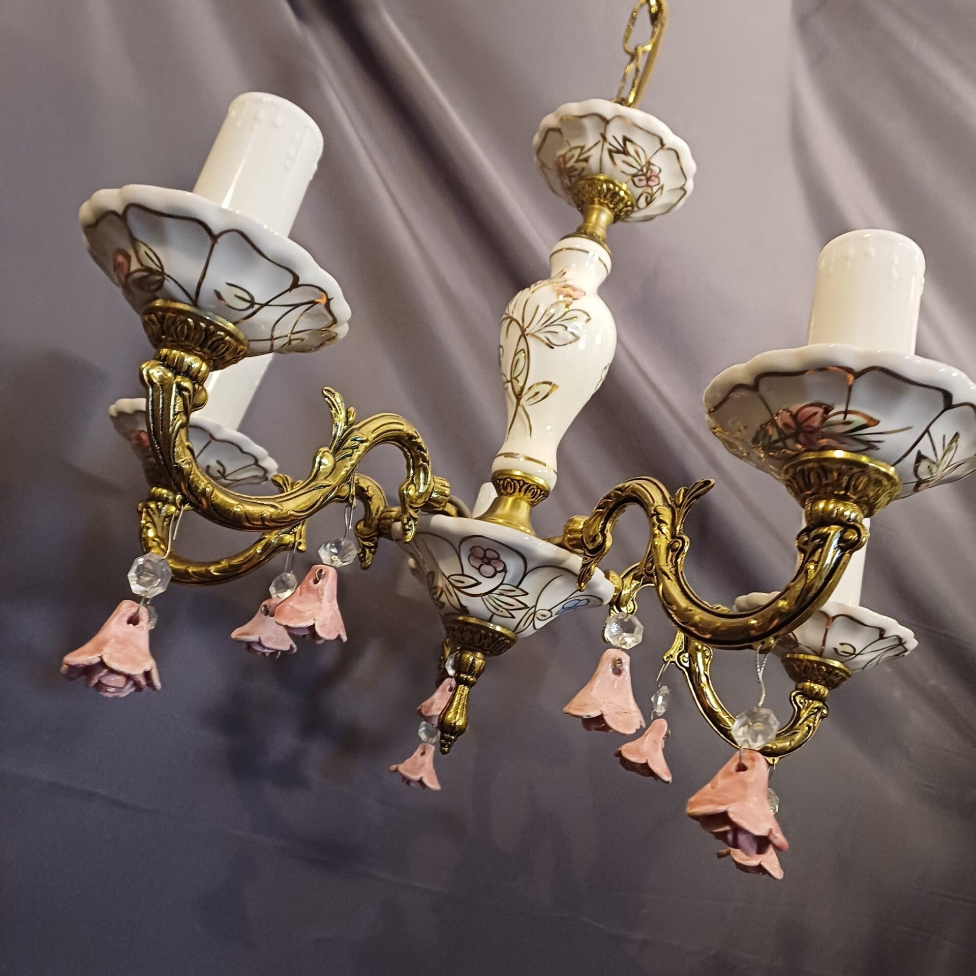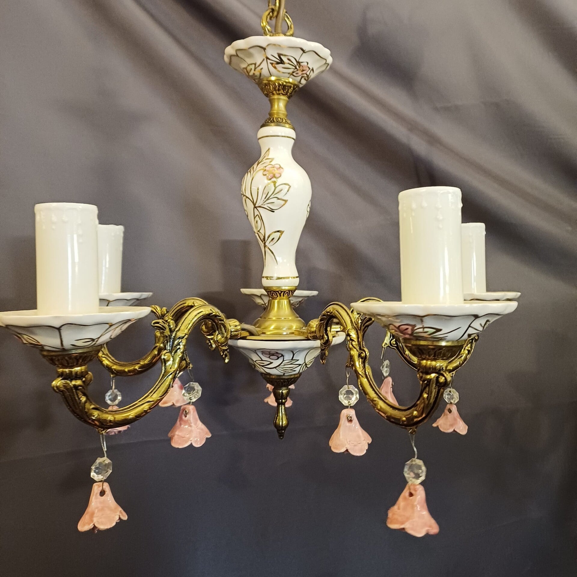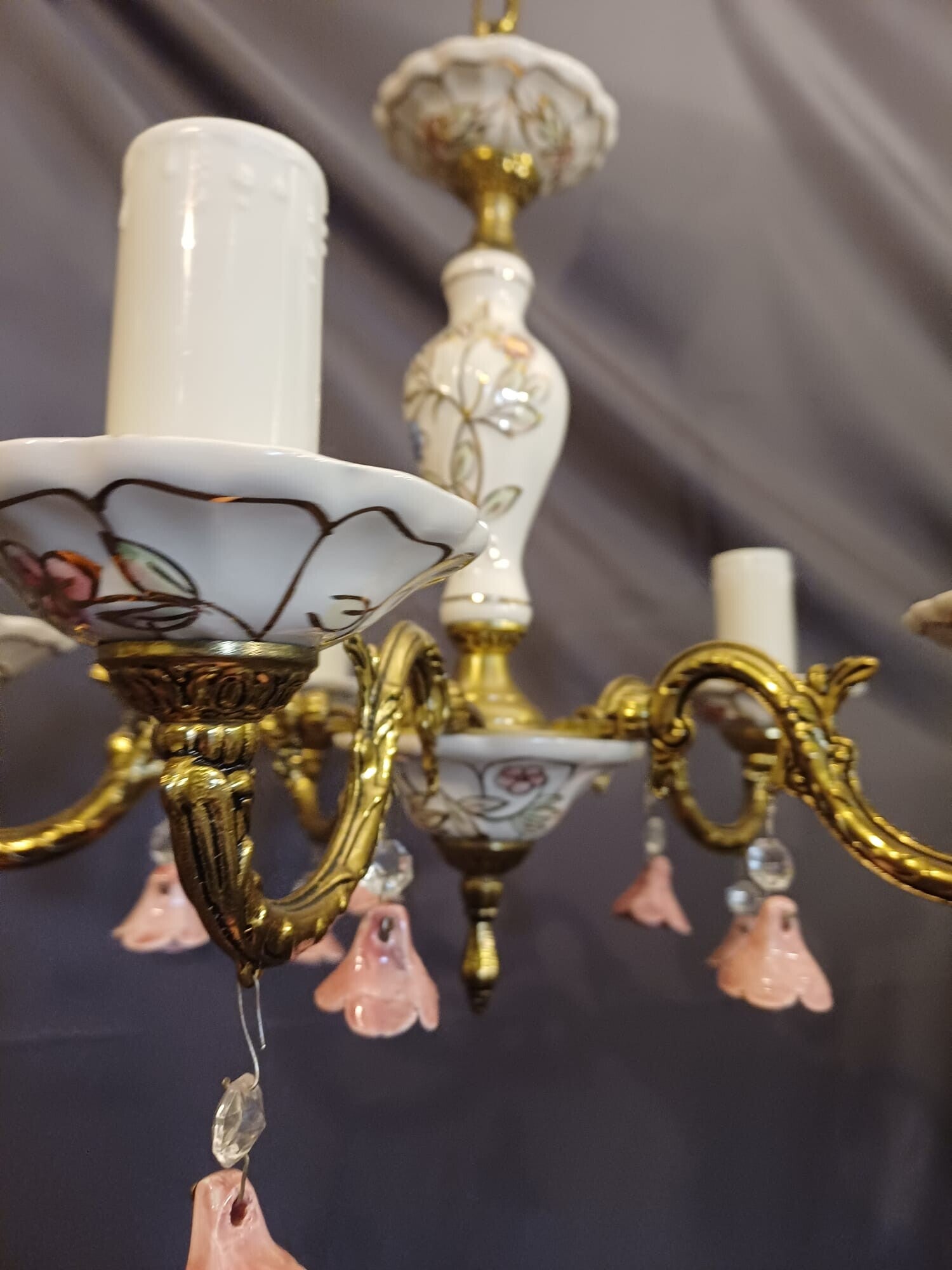 Beautiful Capodimonte style gilt and ceramic 5 light chandeliers. Lovely original condition with highly decorative floral motif. Tested and ready to hang. The ceiling drop is currently 55cm and the chandelier measures 46cm across.