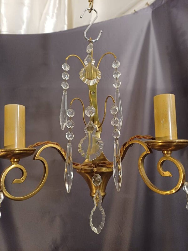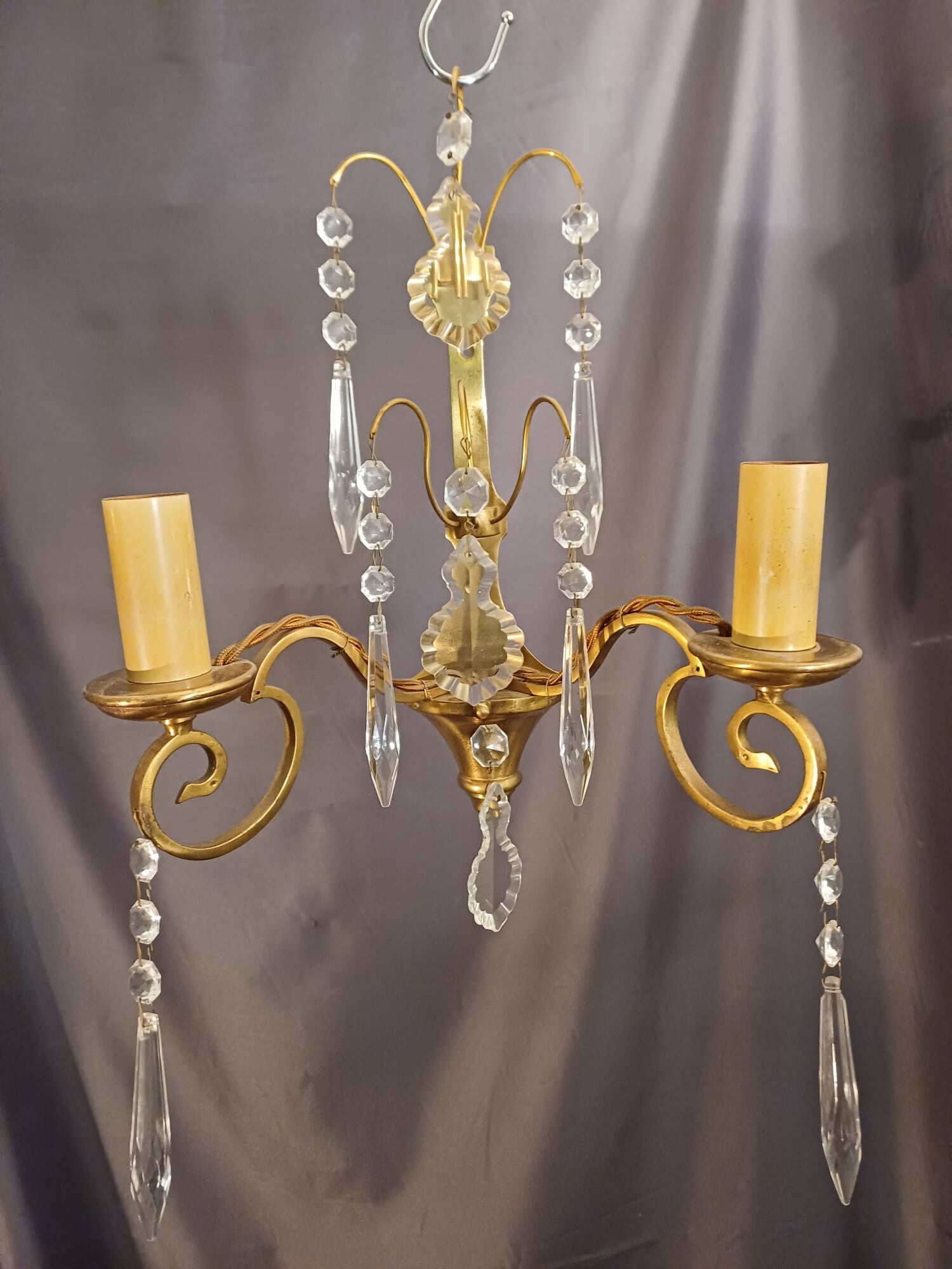 Beautiful pair of tall antique French brass wall lights with decorative crystal droplets. Lovely original condition, rewired and tested. Overall height is 43cm.