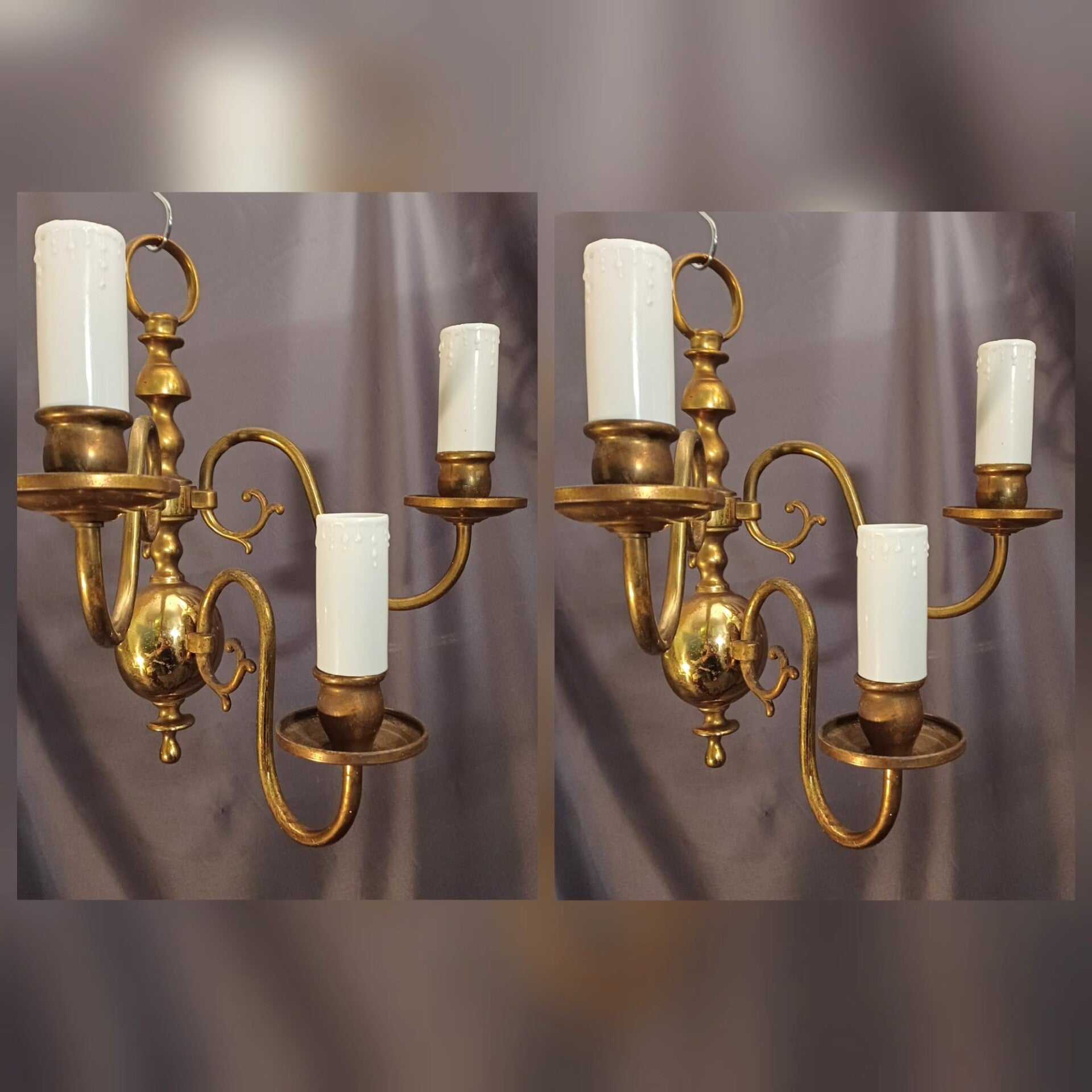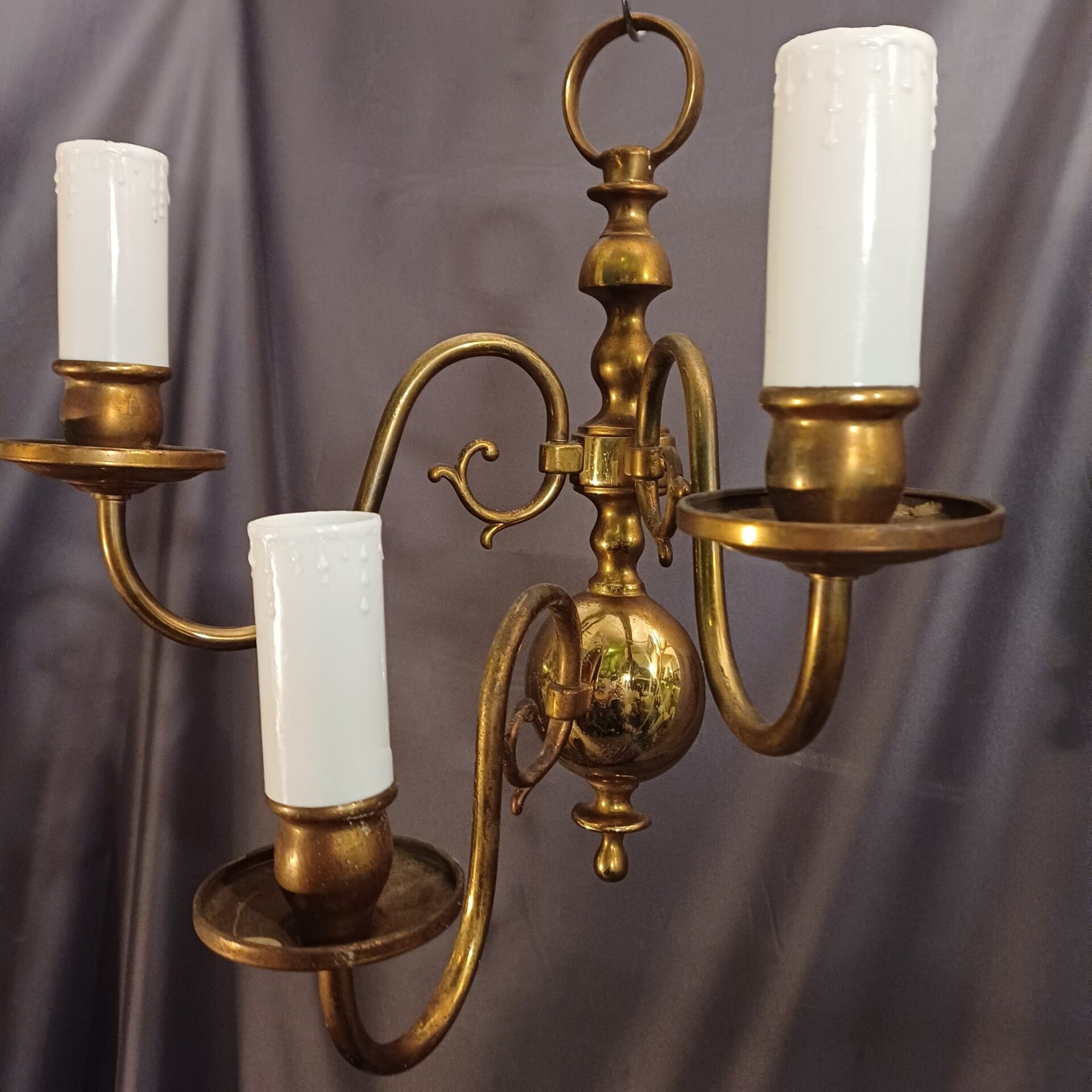 Lovely pair of antique Flemish brass three arm wall lights. Lovely patina as to be expected yet rewired, earthed and tested. Ready to hang.H36cm, W33cm, D22cm.