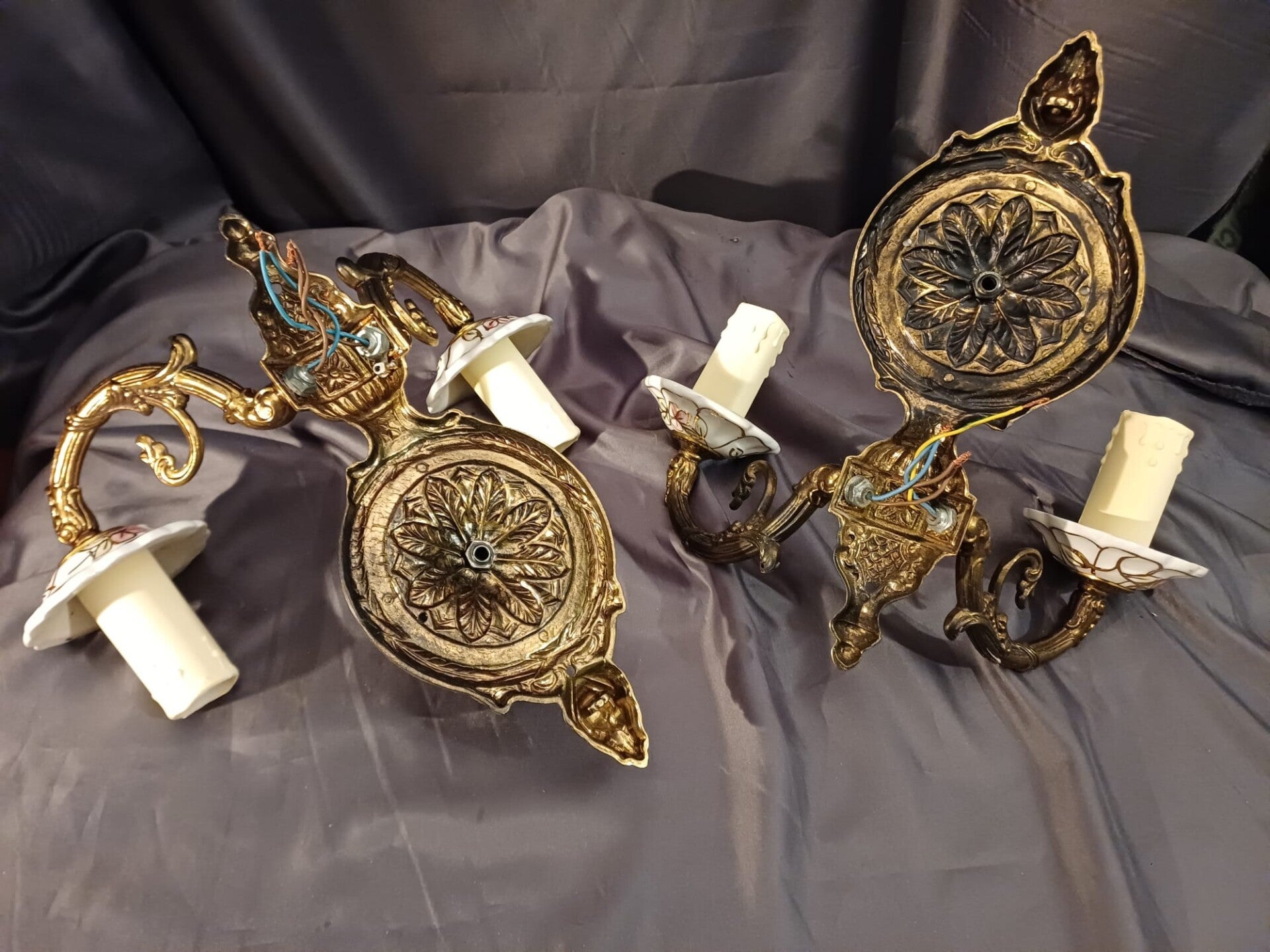 Set of two Capodimonte style double wall lights. Beautiful condition, tested and ready to hang. Lovely ornate gilt frame with white glazed ceramic inserts. Pretty handpainted floral decoration.H31cm, W33cm, D15cm.
