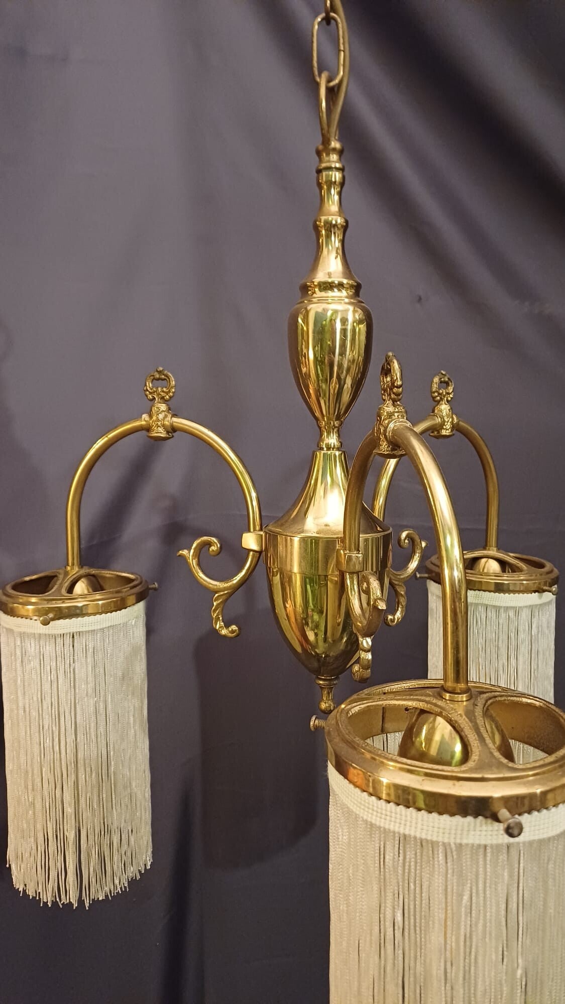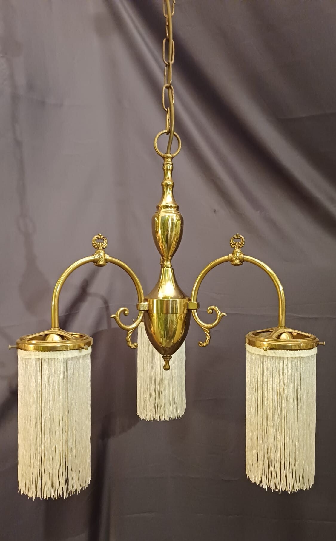 This is a lovely, elegant and very unusual solid brass Art Nouveau 3 arm ceiling light. Beautiful cream fringing on the shades. Tested and ready to hang. A substantial piece yet with a very delicate understated appeal. The light itself is 55cm in height and 45cm across. The ceiling drop is 90cm.