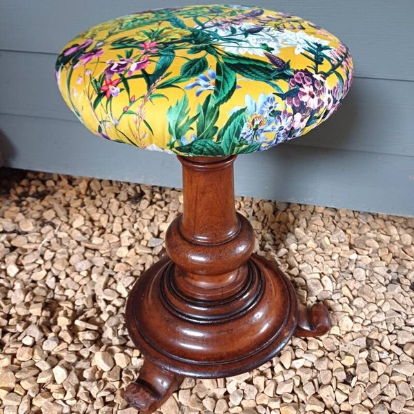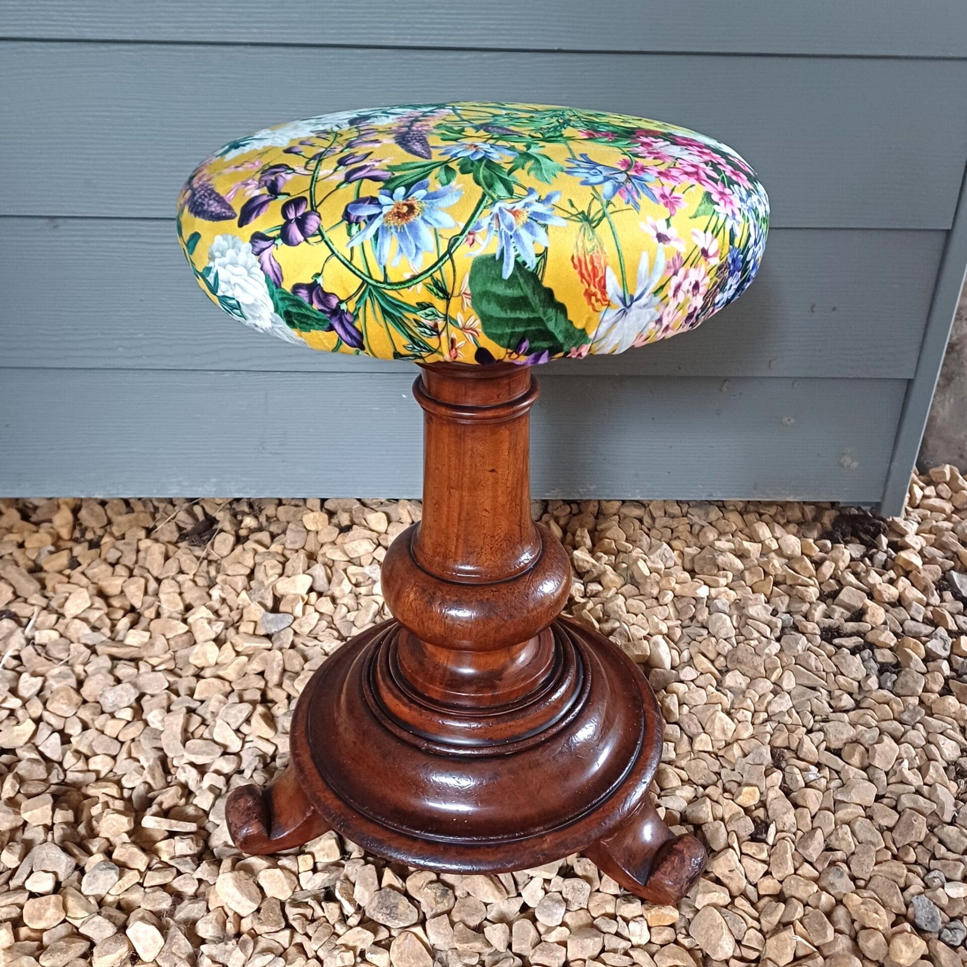Beautiful solid mahogany antique Victorian swivelling piano/dressing table stool. Reupholstered in this lovely Summer Meadow velvet. The seat is 36cm in diameter, & the seat height is 49cm.