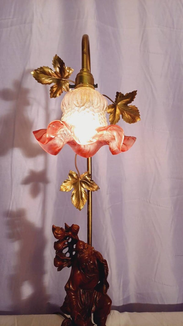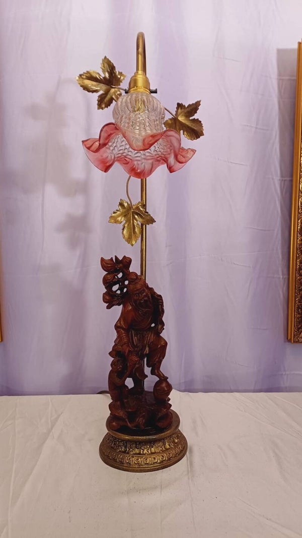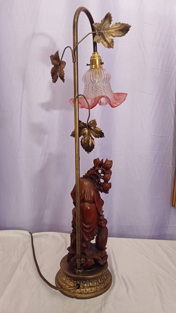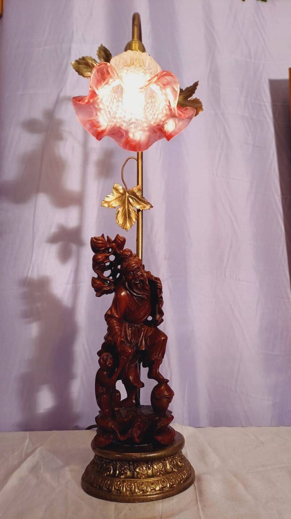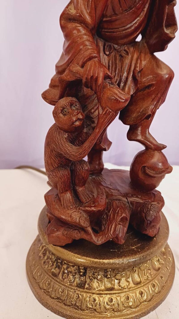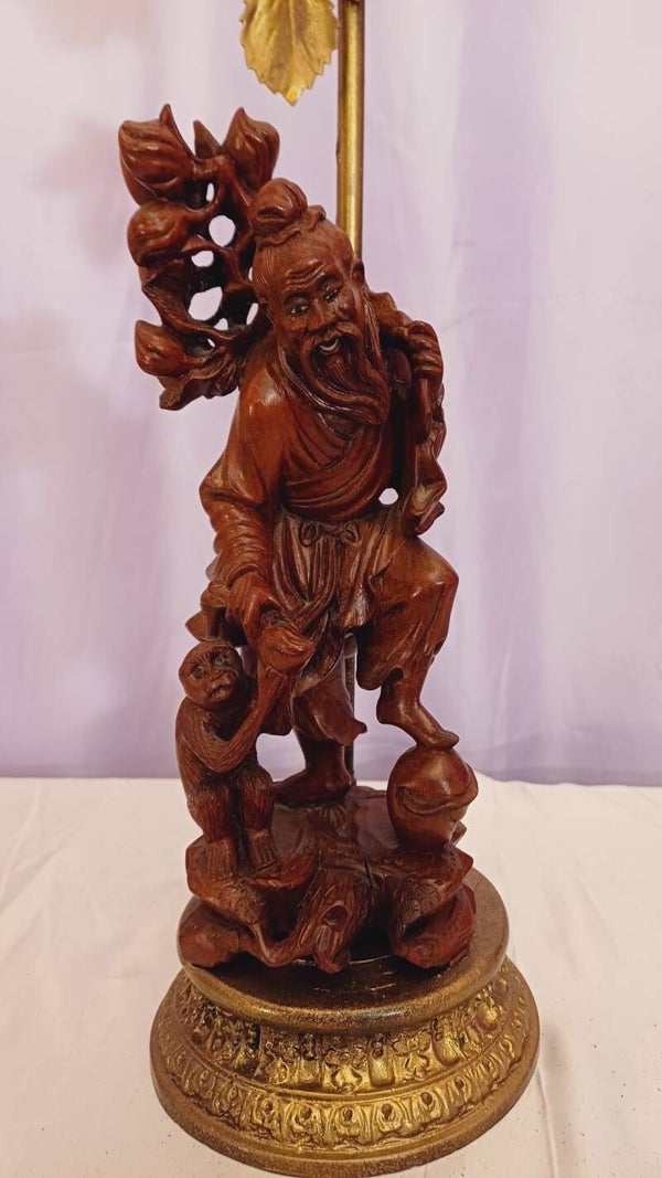Fabuously detailed and beautifully carved rosewood Chinese Immortal character lamp. An old man collecting fruit with a cute little monkey tagging along. Rewired and tested.