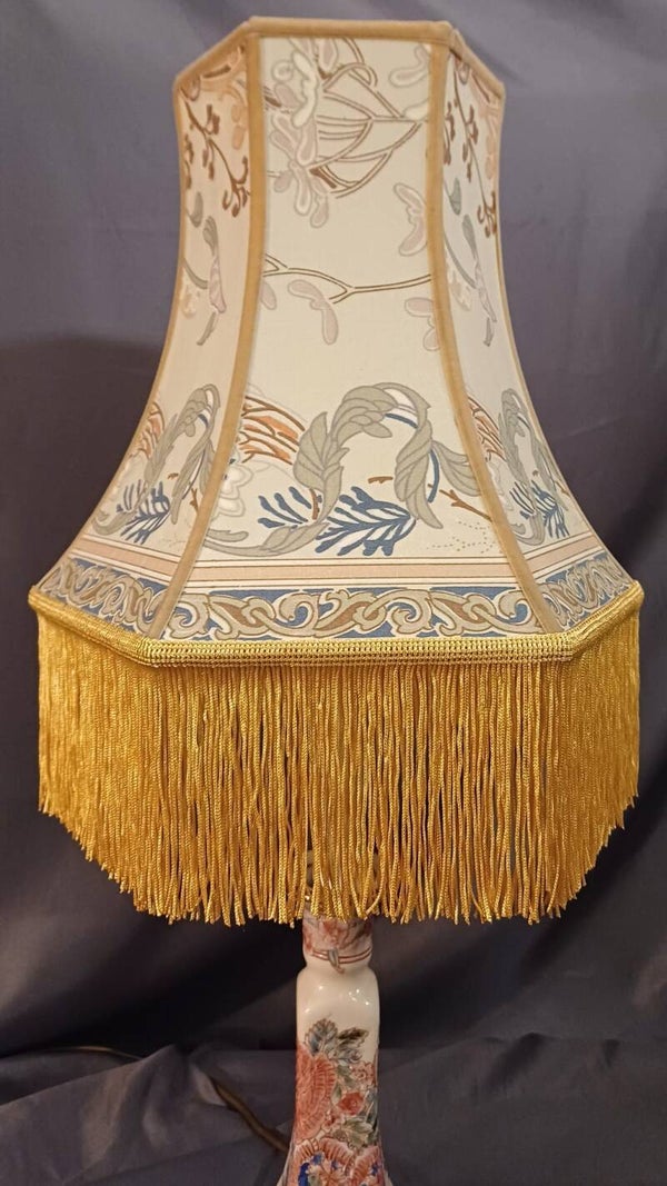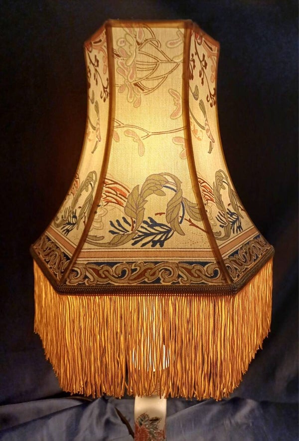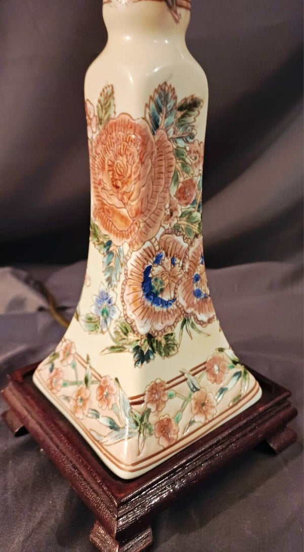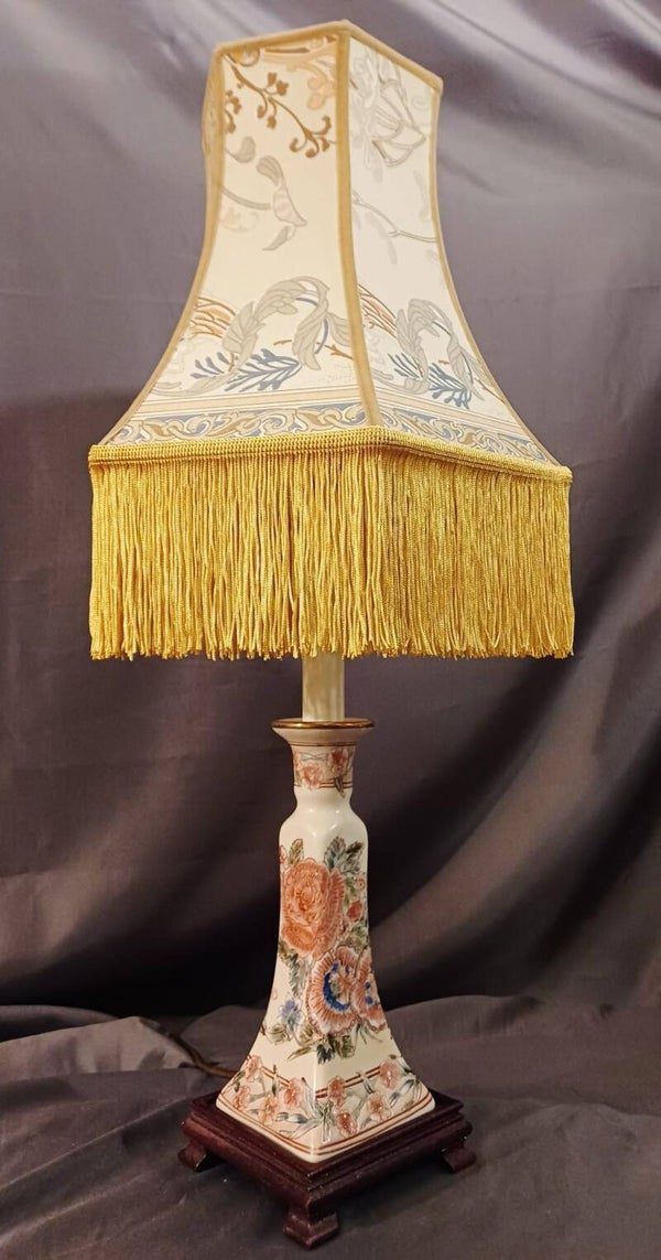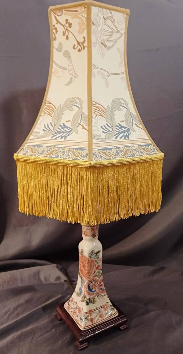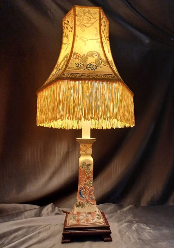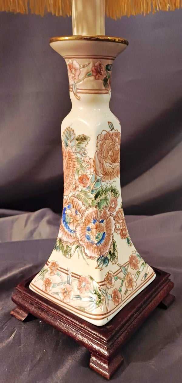 Fabulous chinoiserie porcelain handpainted candlestick lamp with raised flower motif. Lovely pagoda shade subtle floral design and trimmed with a deep full gold fringe. Beautiful condition, tested and ready to use.