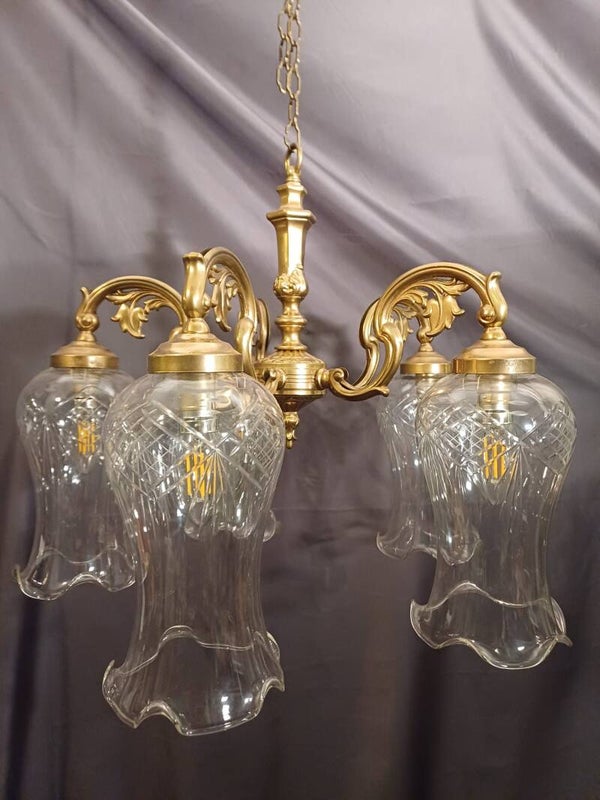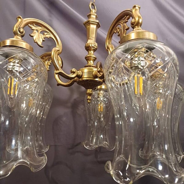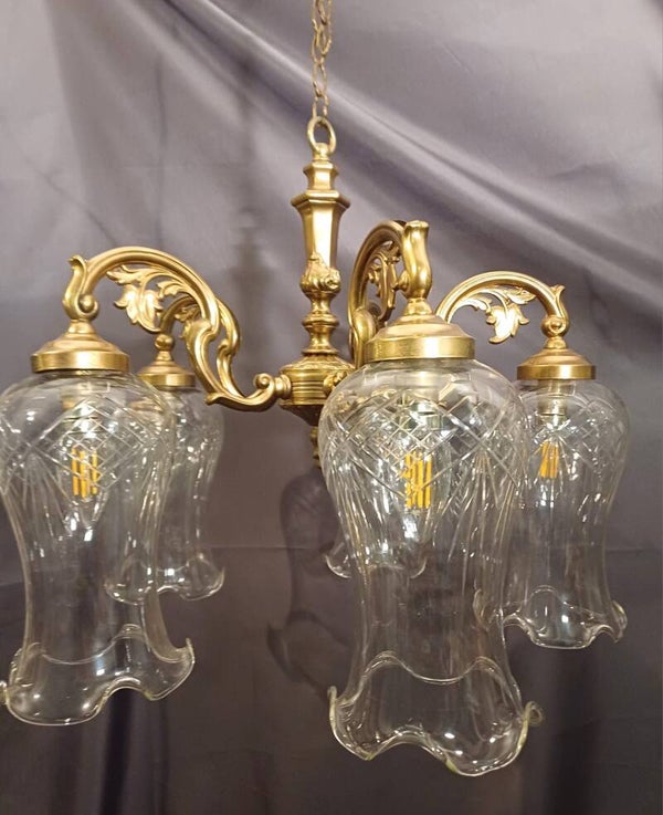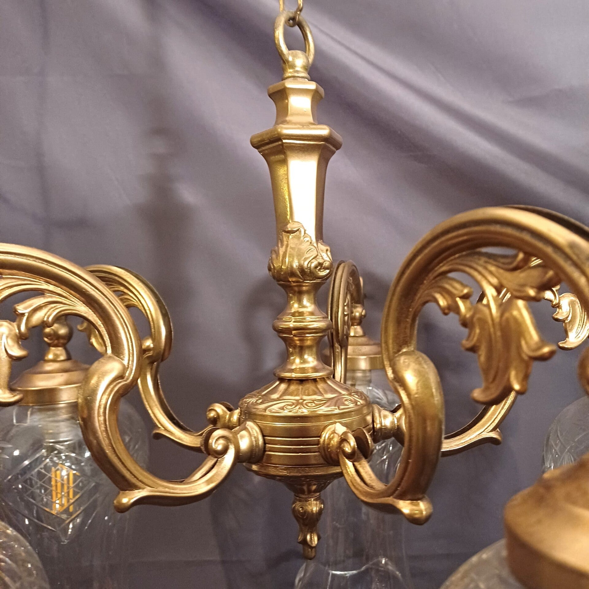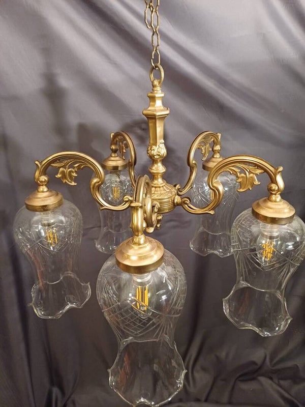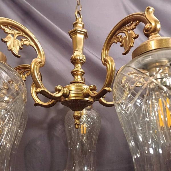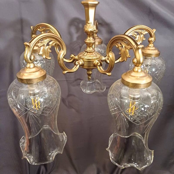 Wonderfully ornate gothic vintage gold 5 arm chandelier with large clear cut glass shades. Very unusual and striking. Takes standard B22 candle bulbs. Tested and ready to hang. The chandelier itself measures 42cm in height and is 49cm across. The ceiling drop is currently 70cm.